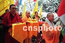 圖:百名僧侶參加紀(jì)念佛教?hào)|傳2000年大法會(huì) 2001年5月9日 19:44 ![]() 中國(guó)西藏、云南、江蘇、廣東等地的近百名僧侶二十二日在北京西山靈光寺參加紀(jì)念佛教?hào)|傳2000年大法會(huì)。中新社記者 鄒憲 攝