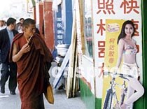 在西藏拉薩市到處可以可見現(xiàn)代生活的沖擊,柯達膠卷的廣告女郎引起了一位寺院僧人的注目。中新社圖 吳新華 攝