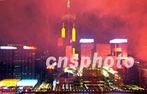 香港五月八日晚舉行祝賀“2001年《財富》論壇”煙花匯演,異彩紛呈的煙花使主會場的會展中心呈現(xiàn)出夢幻的感覺。中新社圖 洪少葵 攝