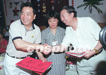 北京市兒童福利院名譽(yù)副院長(zhǎng)、著名笑星姜昆(左)日前在北京清河接受各屆人士為北京市兒童福利院的捐款。中新社圖 史利 攝