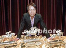 歌星李克勤1日在香港出席「2000/01年度香港賽馬會冠軍人馬獎」記者會,與多個精致馬匹獎座合照。中新社傳真鄧慶樂攝