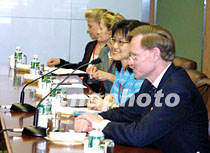 石廣生會(huì)見(jiàn)美貿(mào)易代表 雙方還將進(jìn)一步商議 2001年6月5日 15:44 ![]() 石廣生與美國(guó)貿(mào)易談判代表羅伯特·佐立克一行會(huì)晤。中新社記者 潘索菲 攝 ![]() 二○○一年APEC貿(mào)易部長(zhǎng)會(huì)議將于六月六日開(kāi)幕。會(huì)議主席、中國(guó)外經(jīng)貿(mào)部部長(zhǎng)石廣生和中國(guó)代表團(tuán)團(tuán)長(zhǎng)、外經(jīng)貿(mào)部首席談判代表龍永圖,五日在上海國(guó)際會(huì)議中心與經(jīng)濟(jì)體代表團(tuán)團(tuán)長(zhǎng)舉行雙邊會(huì)談。圖為美國(guó)貿(mào)易談判代表羅伯特·佐立克。中新社記者 潘索菲 攝