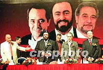 圖:三大男高音演唱會(huì)新聞發(fā)布會(huì) 2001年06月21日 18:46 ![]() 世界三大男高音北京紫禁城演唱會(huì)新聞發(fā)布會(huì)21日在北京舉行,先期到達(dá)北京的帕瓦羅蒂、卡雷拉斯和三大男高音的經(jīng)濟(jì)人魯?shù)浪沟瘸鱿⒒卮鹆酥型庥浾叩奶釂枴V行律缬浾?李剛 攝