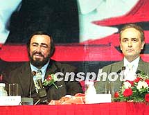 21日在北京參加世界三大男高音北京紫禁城演唱會新聞發(fā)布會的帕瓦羅蒂在回答記者提問時說:“中國應該承辦2008年奧運會”。中新社記者 李剛 攝