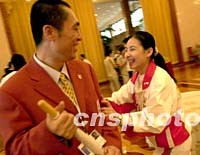 中國(guó)著名導(dǎo)演張藝謀與奧運(yùn)會(huì)冠軍劉璇,在中國(guó)駐莫斯科大使館互相祝賀北京申辦奧運(yùn)會(huì)成功。中新社記者 賈國(guó)榮 攝