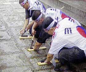 圖文:韓國20人斬斷手指抗議小泉參拜靖國神社 2001年08月13日 15:06 ![]() 法新/圖 中新網(wǎng)北京8月13日消息:韓國漢城二十人公開斬斷手指,以血抗議日本首相小泉純一郎參拜靖國神社。 據(jù)韓國電視臺報道,二十名男子在漢城獨立門前抗議,高叫口號,指責(zé)小泉純一郎到供奉戰(zhàn)犯的靖國神社參拜。男子接著拿出長柄大鐮刀,斬斷尾指抗議。 有目擊者表示,該批男子較早時被阻止在日本大使館前示威。警方暫時沒有評論事件。 |