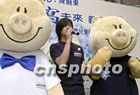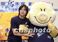 「齊心獻愛寫未來」義賣大行動將于18及19日在香港三十多個大型商場及地鐵站展開義賣行動,為「中國女童教育項目」籌募經(jīng)費,圖為陳曉東與義賣精品主角“豬扒家族”成員:豬扒(左)、碧琪(右)。中新社傳真 鄧慶樂 攝