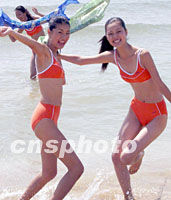 圖:中國(guó)模特海邊戲浪 2001年08月20日 15:21 ![]() 在美麗的青島海邊,兩名參加一場(chǎng)模特大賽的靚女身穿泳裝,舞動(dòng)著絲巾在海浪中盡情起舞。中新社記者 錢興強(qiáng) 攝