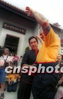 圖文:海外黃飛鴻門人到廣東佛山尋根拜祖 2001年08月28日 06:15 ![]() 南粵武林一代宗師黃飛鴻的一百多名海外弟子,27日在佛山黃飛鴻紀(jì)念館依照傳統(tǒng)武林習(xí)俗祭拜祖師黃飛鴻。他們是專程從美國(guó)、德國(guó)、瑞典等地來(lái)粵參加佛山黃飛鴻紀(jì)念館全面開(kāi)業(yè)暨黃飛鴻一百四十五周年寶誕尋根拜祖等系列活動(dòng)的。中新社記者 梁永強(qiáng) 攝 ![]() 27日,來(lái)自美國(guó)的黃飛鴻傳人、著名武術(shù)家余志偉在佛山黃飛鴻紀(jì)念館前為其洋弟子舉行隆重的入室弟子授腰帶儀式,以示對(duì)祖師的崇敬。中新社記者 梁永強(qiáng) 攝