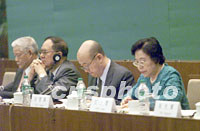 ![]() 聯(lián)合國環(huán)境規(guī)劃署官員巴克利·肯特四日在北京出席“21世紀(jì)論壇-綠色與環(huán)保2001年會(huì)議”,并作演講。中新社記者 滿會(huì)喬 攝 ![]() “21世紀(jì)論壇-綠色與環(huán)保2001年會(huì)議”四日在北京開幕,全國政協(xié)副主席葉選平(左一)、宋健(左二)、中國林業(yè)科學(xué)研究院院長江澤慧(右一)等出席開幕式。中新社記者 滿會(huì)喬 攝