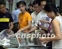![]() 廣州市民十分關(guān)注美國(guó)受到恐怖襲擊事件。十二日清晨,人們紛紛上街購(gòu)買當(dāng)天報(bào)紙,令不少報(bào)紙脫銷,報(bào)社不得不連忙加印。某晚報(bào)還加出號(hào)外。中新社圖 梁永強(qiáng) 攝