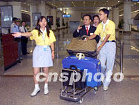 組圖:志愿者迎接即將開(kāi)幕的華商大會(huì)代表 2001年09月16日 15:50 ![]() 服務(wù)于第六屆世界華商大會(huì)的志愿者十六日在南京機(jī)場(chǎng)迎接參加大會(huì)的來(lái)賓,華商會(huì)十七日將在南京拉開(kāi)帷幕。中新社記者 史利 攝 ![]() 出席第六屆世界華商大會(huì)的國(guó)內(nèi)工商界人士十六日陸續(xù)抵達(dá)南京,來(lái)自南京各高校的志愿者在機(jī)場(chǎng)熱情接待來(lái)賓。中新社記者 史利 攝
