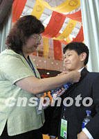 圖:本屆華商大會最小的代表 2001年09月19日 14:07 ![]() 本屆華商大會年齡最小的代表,來自英國十一歲的何明高特意請假隨父母出席大會,并希望有朝一日繼承父業(yè)來華投資。中新社記者 鄭萍萍 攝 |