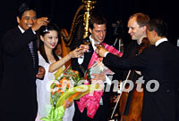 組圖:周潤發(fā)出席澳門國際音樂節(jié) 2001年10月05日 18:57 ![]() 由奧斯卡金像獎獲得者譚盾(右一)指揮、由多名國際音樂家和上海交響樂團(tuán)演出的"臥虎藏龍"音樂會,4日晚在"第十五屆澳門國際音樂節(jié)"演出成功后,周潤發(fā)向音樂家表示祝賀。中新社圖 任晨鳴 攝 ![]() 香港巨星周潤發(fā)4日到澳門出席"第十五屆澳門國際音樂節(jié)"中的"臥虎藏龍"音樂會后,澳門特區(qū)政府社會文化司司長崔世安向周潤發(fā)頒發(fā)紀(jì)念品。中新社圖 任晨鳴 攝