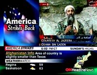 圖:美國電視節(jié)目中的本·拉登 2001年10月08日 10:57 ![]() 美軍協(xié)同英軍開始對阿富汗境內(nèi)恐怖組織訓(xùn)練營以及塔利班政權(quán)的軍事設(shè)施展開軍事打擊。其后不久,卡塔爾一家電視臺首先播放了本·拉登講話的錄像。拉登說:“我對真主起誓,除非巴勒斯坦人民能夠享受到和平,否則美國人將永遠(yuǎn)不知和平為何物!泵绹芯電視網(wǎng)(CNN)在其黃金時(shí)間的節(jié)目中,反復(fù)播放拉登的錄相,提醒人們警惕新的恐怖報(bào)復(fù)行動。 |