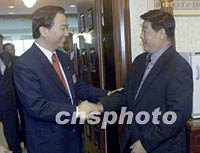 圖文:兩岸"三通"后臺(tái)灣客機(jī)可飛越大陸航區(qū) 2001年10月12日 17:14 ![]() 國(guó)家民航總局副局長(zhǎng)鮑培德十二日在北京會(huì)見了以馮滬祥(右)為團(tuán)長(zhǎng)的臺(tái)灣兩岸空運(yùn)直航訪問(wèn)團(tuán)。臺(tái)灣方面的遠(yuǎn)東航空、復(fù)興航空、中華航空等六家航空公司的有關(guān)負(fù)責(zé)人作為訪問(wèn)團(tuán)成員參加了會(huì)見。中新社記者 滿會(huì)喬 攝