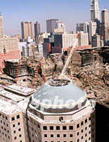 圖:紐約世貿(mào)中心斷垣殘壁 2001年10月13日 11:35 ![]() 采訪者近日從曼哈頓高處鳥瞰紐約世貿(mào)中心一號樓和周邊建筑廢墟,前面圓頂樓為世界金融中心,美林、運通、李門兄弟等著名金融公司就設(shè)在這里!熬乓灰弧笨植酪u擊前,金融中心有天橋與世貿(mào)中心相連,“九一一”時天橋坍塌,樓頂現(xiàn)布滿建筑破損物。中新社圖 龔文謨 攝 |