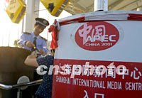 圖:APEC會議新聞中心出入關(guān)口 2001年10月13日 19:27 ![]() 本屆APEC會議的新聞發(fā)布廳設(shè)置在上海東方明珠大廈,目前出入大廈的人員都必須經(jīng)過門口警衛(wèi)的嚴(yán)格證件檢查。中新社圖 劉殊瑾 攝 |