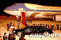 ![]() 美國(guó)總統(tǒng)布什乘坐空軍一號(hào)專(zhuān)機(jī)十八日黃昏飛抵上海浦東國(guó)際機(jī)場(chǎng),立即坐進(jìn)總統(tǒng)專(zhuān)車(chē)駛?cè)胧袇^(qū)。中新社記者 賈國(guó)榮 攝 |