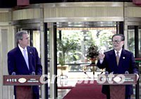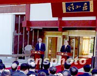 ![]() 十月十九日,美國總統(tǒng)布什在上海西郊賓館“睦如居”與中國國家主席江澤民會談,并共同在此舉行記者招待會。“睦”為和睦,“如”為如意。以此命名的江南風格賓館,是外國元首下榻之地。中新社記者 賈國榮 攝