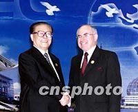 圖:江澤民迎接澳大利亞總理 2001年10月21日 11:14 ![]() 10月20日,中國國家主席江澤民在上海國際會議中心迎接澳大利亞總理霍華德。中新社圖 |