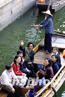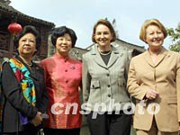 組圖:APEC首腦配偶暢游“中國第一水鄉(xiāng)” 2001年10月21日 14:37 ![]() 香港特別行政區(qū)長官董建華的夫人趙洪娉十月二十一日與參加上海APEC領(lǐng)導(dǎo)人峰會(huì)的首腦夫人一起在水鄉(xiāng)周莊游船,圖為她向岸邊的市民招手。中新社記者 潘索菲 攝 ![]() APEC首腦夫人21日暢游“中國第一水鄉(xiāng)”。香港特首夫人趙洪娉(左)、加拿大克雷蒂安總理夫人艾琳·克雷蒂安(右二)、澳大利亞霍華德總理夫人珍妮特·霍華德(右)與陪同游玩的江蘇省副省長張連珍在周莊一起合影。中新社記者 潘索菲 攝