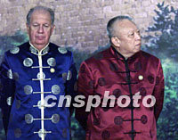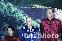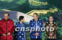 ![]() 美國總統(tǒng)布什身穿唐裝二十一日站在上?萍拣^中國萬里長城圖案背景前,聆聽中國國家主席江澤民宣讀APEC《領(lǐng)導(dǎo)人宣言》。亞太經(jīng)合組織第九次領(lǐng)導(dǎo)人非正式會議二十一日在上海圓滿閉幕。中新社記者 王瑤 攝 ![]() 新加坡總理吳作棟、泰國總理他信、美國總統(tǒng)布什和越南總理潘文凱身穿唐裝21日站在上海科技館中國萬里長城圖案背景前,聆聽中國國家主席江澤民宣讀APEC《領(lǐng)導(dǎo)人宣言》。亞太經(jīng)合組織第九次領(lǐng)導(dǎo)人非正式會議21日在上海圓滿閉幕。中新社記者 王瑤 攝