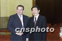 ![]() 國(guó)務(wù)院總理朱镕基與德國(guó)總理施羅德三十一日在北京共同出席中德雙方合作協(xié)議的簽字儀式。中新社記者 滿會(huì)喬 攝 |
