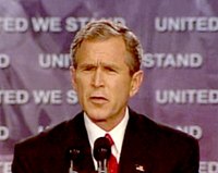 布什再次發(fā)表演講 堅(jiān)信不會(huì)為恐懼謠言所嚇倒(圖) 2001年11月09日 09:47 ![]() 美國(guó)總統(tǒng)布什八日在黃金時(shí)間從阿特蘭大發(fā)表全國(guó)講話。他說(shuō),一個(gè)四歲的小女孩曾給他寫信問(wèn):“那些人都不知道我們是誰(shuí)就攻擊我們。我們干嘛不告訴他們我們叫什么呢?”布什接著說(shuō):“我們會(huì)告訴那些恐怖分子我們是誰(shuí)的,我們會(huì)告訴他們美國(guó)是誰(shuí)!