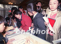 聚焦中國(guó)入世:中國(guó)高校采取舉措應(yīng)對(duì)"入世" 2001年11月10日 22:15 ![]() 入世將給中國(guó)經(jīng)濟(jì)帶來(lái)極大的商機(jī),使金融、國(guó)際貿(mào)易等經(jīng)濟(jì)專業(yè)成為今年研究生報(bào)名的熱點(diǎn)。圖為十日在2002年全國(guó)碩士生招生考試清華大學(xué)報(bào)名點(diǎn),場(chǎng)面十分火爆。中新社記者 張勤 攝