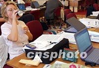圖:各國記者關(guān)注中國入世簽字儀式 2001年11月12日 11:18 ![]() 第四屆WTO部長會議十一晚舉行中國入世簽字儀式和通過臺灣加入世貿(mào)組織時,各國記者在新聞中心緊張工作。圖為一名女記者邊用餐邊寫稿。中新社記者 錢興強 攝 |