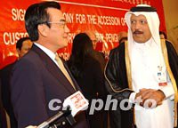 圖:WTO總干事對中國臺(tái)北加入世貿(mào)組織表示祝賀 2001年11月13日 10:08 ![]() 第四屆WTO部長級(jí)會(huì)議十二日在多哈舉行中國臺(tái)北加入世貿(mào)組織議定書簽字儀式。圖為會(huì)議主席卡塔爾財(cái)政、經(jīng)濟(jì)和貿(mào)易大臣卡邁爾,WTO總干事穆爾等向臺(tái)北代表團(tuán)團(tuán)長林信義表示祝賀。中新社記者 錢興強(qiáng) 攝 |