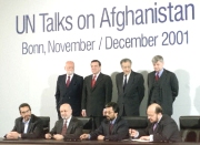 圖文:波恩會談結(jié)束 阿富汗四方簽署分權(quán)協(xié)議 2001年12月05日 19:45 ![]() 四方代表簽署協(xié)議 中新網(wǎng)北京12月5日消息:阿富汗4方代表于當?shù)貢r間5日上10時10分,在波恩附近的彼得斯貝格賓館簽署了關(guān)于成立阿富汗臨時政府的協(xié)議,波恩會談在近9天馬拉松式的談判后終于落下帷幕。 根據(jù)協(xié)議,阿富汗南部普什圖族領(lǐng)導人薩耶德·哈米德·考爾紹伊將出任臨時行政當局主席一職,北方聯(lián)盟則占據(jù)了臨時行政當局中負責內(nèi)政、外交和國防等事務的關(guān)鍵職位。臨時政府由29名成員組成,本月22日起運作,任期6個月。 考爾紹伊曾在20世紀90年代出任過阿富汗副外長,他目前正在阿富汗坎大哈市附近指揮部隊與塔利班士兵作戰(zhàn)。 德國總理施羅德說,協(xié)議的達成顯示國際社會有勇氣和能力解決所面臨的復雜問題,他希望會談各方能夠切實履行所達成的協(xié)議。他說,協(xié)議為阿富汗重建創(chuàng)造了必要的前提,德國將和其他歐盟國家一道,為阿富汗戰(zhàn)后重建提供“實質(zhì)性”的幫助。 在多方壓力下,參加阿富汗問題會談的各方代表經(jīng)過4日晚通宵達旦的艱苦談判,終于在5日清晨就組成臨時政府的人選問題取得一致,從而為協(xié)議的最終簽署鋪平了道路。 |