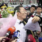 圖文:一討債公司老板向呂秀蓮求婚遭警方攔下 2001年12月11日 13:51 ![]() 呂秀蓮(資料圖片) ![]() 董念臺(tái)11日捧著99朵紅玫瑰,率領(lǐng)48輛豪華禮車,浩浩蕩蕩去向心儀許久的呂秀蓮求婚,但遭警方攔下。董念臺(tái)說(shuō)不能阻止他求婚的意志。(張良一攝) 中新網(wǎng)香港12月11日消息:臺(tái)北訊,臺(tái)灣一討債公司負(fù)責(zé)人董念臺(tái)今天上午演出向呂秀蓮“求婚記”,不過(guò)求婚車隊(duì)在途中即遭到臺(tái)北市警察局?jǐn)r下,董念臺(tái)在不滿下憤而離去。 據(jù)“中央社”報(bào)道,對(duì)于今天的求婚之舉,董念臺(tái)稱,他欣賞呂秀蓮憨直、有話直說(shuō)的個(gè)性,他認(rèn)為呂是位優(yōu)秀的女性。 上午九時(shí)許,由十二輛奔馳、十二輛卡迪拉克高級(jí)轎車組成的車隊(duì)從臺(tái)北市中正紀(jì)念堂出發(fā),浩浩蕩蕩準(zhǔn)備到“總統(tǒng)府”“求婚”。 車隊(duì)在抵達(dá)“總統(tǒng)府”前的貴陽(yáng)路遭轄區(qū)員警攔下,董念臺(tái)穿著燕尾服,手上拿著九十九朵玫瑰和一封求婚信件,他不滿指出,他與呂秀蓮男女未婚,答應(yīng)求婚與否固然是女方的權(quán)利,但求婚也是他的自由,這是人民應(yīng)有的民主法治。 董念臺(tái)說(shuō),如果說(shuō)他妨礙交通,事前他已去函臺(tái)北市警局,但警方并未制止,現(xiàn)在又說(shuō)他違反“集會(huì)游行法”,他認(rèn)為是警方違法在先。 稍后,董念臺(tái)認(rèn)為既然高攀不起,憤而將玫瑰花扔在地上后離去。 相關(guān)報(bào)道:真情?搞笑?臺(tái)灣一討債公司老板向呂秀蓮求婚 |