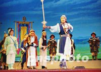 圖文:《射雕英雄傳》搬上京劇舞臺亮相南京 2001年12月12日 08:56 ![]() 武漢市京劇團根據(jù)金庸的武俠小說《射雕英雄傳》改編而成的同名京劇,十二月十日晚在南京大行宮會堂成功上演,成為第三屆中國京劇節(jié)唯一的一臺武俠劇。原著中描寫高深莫測的武功借助京劇中的“出手”及現(xiàn)代特技,得到了較好表現(xiàn)。中新社圖 劉小楚 攝