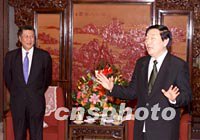 ![]() 中國國務(wù)院總理朱镕基二十六日在北京中南海會(huì)見前來述職的澳門特別行政區(qū)行政長官何厚鏵。中新社記者 毛建軍 攝