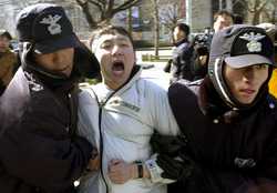 布什來訪前韓民間團體警告美國不要強售戰(zhàn)機(圖) 2002年02月19日 15:00 ![]() 一名抗議布什訪問的韓國學(xué)生被警察帶走 中新網(wǎng)北京2月19日消息:美國總統(tǒng)布什今天即將抵達(dá)韓國首都漢城與金大中總統(tǒng)舉行會談,韓國軍隊和警察處于高度戒備狀態(tài)。 韓國官員表示,一些民間和學(xué)生團體已經(jīng)計劃好在布什訪問時舉行集會和游行示威活動。 數(shù)個民間團體今天警告美國不要對韓國施壓,在兩國首腦會談期間要求購買美國波音公司的F-15戰(zhàn)斗機。 這六個民間團體發(fā)表聯(lián)合聲明說:“F-15戰(zhàn)斗機正在被淘汰。政府不應(yīng)該購買F-15這種即將停產(chǎn)的機型。”