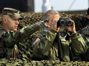 布什視察都羅山車站 稱南北鐵路是和平之路(圖) 2002年02月20日 14:41 ![]() 布什在非軍事區(qū)用望遠(yuǎn)鏡觀望朝鮮一側(cè)(美聯(lián)社) 中新網(wǎng)北京2月20日消息:韓國總統(tǒng)金大中和來訪的美國總統(tǒng)布什今天視察都羅山車站。這個(gè)車站是金大中希望連接平壤和漢城的鐵路線的北終點(diǎn)站。 據(jù)韓國聯(lián)合新聞社報(bào)道,金大中希望借此舉來敦促朝鮮對(duì)恢復(fù)對(duì)話的呼吁作出回應(yīng)。 在上午的首腦會(huì)談中,兩國總統(tǒng)就聽取了這項(xiàng)連接南北的鐵路工程的進(jìn)度情況簡報(bào)。 在舉行聯(lián)合記者招待會(huì)后,布什乘直升飛機(jī)花費(fèi)二十分鐘抵達(dá)非軍事區(qū)。這個(gè)二點(diǎn)五英里寬,一百五十一英里長的區(qū)域布滿地雷,分界線兩側(cè)駐扎著將近朝韓兩百萬軍隊(duì)。 美國在韓國保持有三萬七千人的駐軍。布什在抵達(dá)時(shí)向一名指揮官威廉·米勒中校敬禮致意。 布什在都羅山車站發(fā)表講話。他說:“我們今天相聚在這里,周圍是朝鮮半島和平與穩(wěn)定受到挑戰(zhàn)時(shí)的遺跡。金大中總統(tǒng)剛才向我介紹了一條他修建的道路--一條和平之路! 據(jù)路透社報(bào)道,布什敦促朝鮮對(duì)韓國開放邊境。他說:“這條鐵路可能將這塊分裂的土地兩側(cè)的人民帶到一起來。為了朝鮮半島全體人民的福祉,朝鮮應(yīng)該完成它! 布什在非軍事區(qū)的講話強(qiáng)硬的措詞中也顯示出靈活性。他甚至在談及朝鮮時(shí)仍使用了“邪惡”這個(gè)字眼,但他同時(shí)也重申了朝鮮對(duì)話的建議。 在一個(gè)觀察哨所里,布什身穿一件手臂上繡有美國國旗的綠色軍用夾克,通過雙筒望遠(yuǎn)鏡從壘著沙袋的地堡內(nèi)觀察朝鮮一側(cè)。