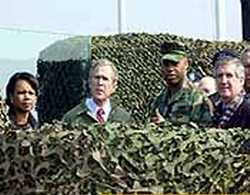 布什近距離"觀察"朝鮮 地堡豎起防彈玻璃(圖) 2002年02月20日 16:04 ![]() 布什所在的地堡內(nèi)豎起了防彈玻璃 中新網(wǎng)北京2月20日消息:韓國(guó)總統(tǒng)金大中和來訪的美國(guó)總統(tǒng)布什今天視察都羅山車站。 在一個(gè)觀察哨所里,布什身穿一件手臂上繡有美國(guó)國(guó)旗的綠色軍用夾克,通過雙筒望遠(yuǎn)鏡從壘著沙袋的地堡內(nèi)觀察朝鮮一側(cè)。 路透社的報(bào)道說,在專門為他視察設(shè)置的防彈玻璃后面,布什望見了一座朝鮮的紀(jì)念館。 安全人員在一側(cè)豎起這塊防彈玻璃,保護(hù)在地堡內(nèi)的布什。他所在的位置距離非軍事區(qū)分離南北兩側(cè)的中央線只有一百米。 從布什的位置望去,朝鮮一側(cè)的哨所都清晰可見。在地堡上面停留十分鐘后,布什和國(guó)務(wù)卿鮑威爾與美國(guó)士兵共進(jìn)午餐。 他們與約二十名美軍士兵一起品嘗了冷盤、炸土豆片、水果和餅干。這些士兵二十小時(shí)都在這個(gè)哨所值勤。 在被問及他觀望朝鮮一側(cè)的感受時(shí),布什回答說:“我們已經(jīng)準(zhǔn)備好了!