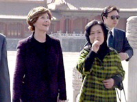 圖:美國(guó)總統(tǒng)夫人勞拉游覽故宮 2002年02月21日 19:29 ![]() 美國(guó)總統(tǒng)布什的夫人勞拉二十一日在中方人員陪同下興致勃勃地游覽故宮。