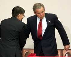 幽默和尷尬——外電報道布什訪華過程花絮(圖) 2002年02月22日 17:08 ![]() 清華校長王大中扶住差點絆倒的布什(美聯(lián)社) 中新網(wǎng)北京2月22日消息:布什對中國的訪問在坦誠和熱情的氣氛中進行,兩國領(lǐng)導人就中美關(guān)系和國際形勢等重大問題進行了重要的會談,而訪問過程中也出現(xiàn)了一些有趣的花絮。 布什遇上兩次小麻煩 據(jù)德新社報道,今天布什座車的輪胎在赴宴途中爆裂,迫使他換乘后面的車輛。當時他剛結(jié)束在清華大學的演講,正趕往北京市中心的中南海與江澤民主席共進午餐。布什被迫放棄自己的豪華轎車,但是沒有延誤他與江主席的會晤。爆胎是美國總統(tǒng)今天遇上的第二次尷尬。 此前,布什在清華大學的演講贏得了兩三百名學生的熱烈掌聲,但是提問環(huán)節(jié)結(jié)束后,他在走過講臺準備與中國官員握手時腳底絆了一下。布什顯然試圖化解這一尷尬場面,順勢做了要與一名中國官員擁抱的樣子。 清華演講不乏幽默 美國的《紐約時報》的報道說,布什在中國高等學府清華大學的演說時有幽默之處。在提問環(huán)節(jié),布什的中文譯員最開始居然準備把總統(tǒng)的回答翻譯成她自己“出色”的英語。布什笑著說:“她在糾正我的英語! 還有一次,一名學生問布什是否鼓勵自己的雙胞胎女兒來中國學習。布什再次笑答:“恐怕她們不再聽我的話啦,如果你明白我的意思的話!