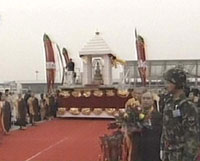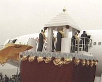 組圖:法門(mén)寺佛指舍利在咸陽(yáng)機(jī)場(chǎng)登上專(zhuān)機(jī)赴臺(tái) 2002年02月23日 09:24 ![]() 機(jī)場(chǎng)恭送法會(huì)上,佛指舍利徐徐移向?qū)C(jī)。 ![]() 臺(tái)灣信眾在咸陽(yáng)機(jī)場(chǎng)虔誠(chéng)地恭送佛指舍利登機(jī)。 ![]() 機(jī)械平臺(tái)升高后,佛指舍利靠向機(jī)艙門(mén)。 ![]() 佛指舍利進(jìn)入機(jī)艙。 ![]() 咸陽(yáng)機(jī)場(chǎng)的佛指舍利恭送法會(huì)。 中新網(wǎng)西安2月23日消息:(記者張素平)今天上午9點(diǎn)整,運(yùn)載佛骨舍利的“港龍航空”公司KA8943航班從陜西西安咸陽(yáng)機(jī)場(chǎng)起飛。 此前,從早晨8:10時(shí)開(kāi)始,在機(jī)場(chǎng)舉行了約15分鐘的恭送儀式。 運(yùn)載佛指舍利和大陸佛教界護(hù)法團(tuán)、護(hù)送團(tuán)及臺(tái)灣佛教界恭迎團(tuán)的兩架專(zhuān)機(jī),將在約中午時(shí)分在香港作短暫停留,轉(zhuǎn)機(jī)后飛往臺(tái)北。 據(jù)悉,作為佛教圣物和無(wú)價(jià)國(guó)寶的佛指舍利,將在臺(tái)灣巡回瞻禮37天,之后由島內(nèi)佛界恭送之后返回法門(mén)寺。此次佛指舍利赴臺(tái)是根據(jù)臺(tái)灣地區(qū)佛教界的請(qǐng)求,由中央政府特別批準(zhǔn)的。這是海峽兩岸的佛門(mén)盛事。 此次大陸佛教界組成了60人護(hù)送團(tuán)和20人護(hù)法團(tuán)恭送佛指舍利赴臺(tái)瞻禮。臺(tái)灣佛教界表示將本著“聯(lián)合迎請(qǐng),共同供奉”的原則,在臺(tái)北、臺(tái)中、高雄等地公共場(chǎng)所和佛教寺院供奉。