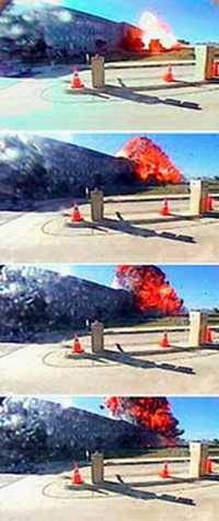 組圖:美國媒體公布飛機(jī)撞擊五角大樓瞬間照片 2002年03月08日 09:43 ![]() 五角大樓北面的監(jiān)視鏡頭拍攝的撞擊場面 中新網(wǎng)北京3月8日消息:美國傳媒公開一組去年“九·一一”恐怖襲擊事件中,國防部所在的五角大樓遭被劫持客機(jī)撞擊瞬間的照片。 據(jù)美聯(lián)社報道,這組照片共有五幅,是由懸掛在五角大樓北面的一個監(jiān)視鏡頭拍攝的。從照片中看,五角大樓北側(cè)遭飛機(jī)撞擊時,從地面騰起一團(tuán)火焰,并冒出滾滾濃煙。