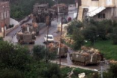 圖文:中東局勢驟變 以色列宣布阿拉法特為敵人 2002年03月29日 14:28 ![]() 以軍坦克開入拉馬拉包圍阿拉法特總部(法新社) 中新網(wǎng)北京3月29日消息:以色列今天宣布巴勒斯坦領(lǐng)導(dǎo)人阿拉法特為敵人,并派兵襲擊他在西岸城市拉馬拉的總部。 巴勒斯坦安全部隊和以色列軍隊爆發(fā)槍戰(zhàn)。以軍一輛推土機(jī)將阿拉法特總部大院的外墻撞開一個大洞,以軍坦克向其辦公室大樓發(fā)射炮彈,引起大火。 巴勒斯坦安全官員說,阿拉法特當(dāng)時就在總部大樓內(nèi),但是他沒有受到傷害。 以色列總理沙龍在舉行內(nèi)閣會議后發(fā)表電視講話說:“政府決定視恐怖聯(lián)盟的頭目阿拉法特為敵人,現(xiàn)階段必須將他孤立! 沙龍還說:“以色列軍隊現(xiàn)在已經(jīng)進(jìn)入阿拉法特在拉馬拉的總部,以軍將在巴勒斯坦民族權(quán)力機(jī)構(gòu)的全境追捕他們! 以色列國防部長埃利澤稱拉馬拉市為“恐怖之都”。埃利澤表示,一色了無意“重新占領(lǐng)巴勒斯坦領(lǐng)土”。他說:“我們唯一想要做的就是打擊恐怖主義的基礎(chǔ)! 巴勒斯坦內(nèi)閣部長艾里卡特說,以色列的行動等于是宣布對巴勒斯坦的“全面戰(zhàn)爭”。艾里卡特在拉馬拉的總部說:“這顯然是對巴勒斯坦人的宣戰(zhàn)。” 艾里卡特說:“奉行國際恐怖主義的以色列政府已經(jīng)宣布全面戰(zhàn)爭。沙龍意圖摧毀巴勒斯坦民族權(quán)力機(jī)構(gòu)與和平進(jìn)程!