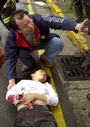 組圖:臺(tái)灣“三三一”地震臺(tái)北災(zāi)難現(xiàn)場(chǎng) 2002年04月01日 09:02 臺(tái)北百層金融大樓起重機(jī)墜落現(xiàn)場(chǎng)。(法新) ![]() 警察查看從工地墜落的起重機(jī)。(法新) ![]() 一名男童在地震中受傷。(法新) ![]() 一駕車(chē)女子受傷,等待接受救治。(美聯(lián)) ![]() 救援人員搶救一名傷者。(法新)