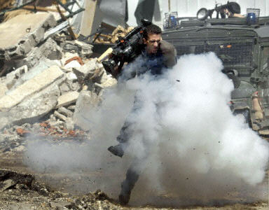 圖文:以軍在阿拉法特總部前向記者發(fā)射震撼彈 2002年04月05日 20:26 中新網(wǎng)北京4月5日消息:以色列部隊(duì)今天在拉姆安拉向巴勒斯坦領(lǐng)導(dǎo)人阿拉法特總部前的記者發(fā)射震撼彈。 事發(fā)時(shí),大批外國(guó)記者趕到現(xiàn)場(chǎng)報(bào)道美國(guó)中東和平特使津尼定于當(dāng)天與阿拉法特的會(huì)晤。 圖為以軍發(fā)射震撼彈時(shí),路透社的巴勒斯坦籍?dāng)z像記者伊斯梅爾·卡代爾試圖躲避。(法新圖) 相關(guān)報(bào)道:以軍向國(guó)外記者投擲震撼彈 尚不知有無(wú)傷亡