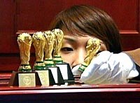 圖:韓國(guó)商人在世界杯前推出仿制大力神杯收藏品 2002年04月09日 14:59 ![]() 世界杯在即,韓國(guó)商人推出仿制大力神杯收藏藝術(shù)品。