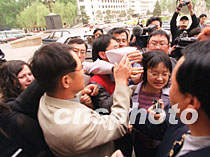 圖:在京媒體密切關(guān)注國航墜機(jī)事件 2002年04月15日 20:04 ![]() 15日,中國國航班機(jī)墜毀的消息傳出后,國航官員向守候在首都機(jī)場辦公樓外的各國媒體分發(fā)材料時,被團(tuán)團(tuán)圍住。中新社記者 鄭萍萍 攝