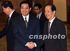 ![]() 中國(guó)國(guó)家副主席胡錦濤二十三日離開(kāi)北京,前往馬來(lái)西亞、新加坡、美國(guó)訪問(wèn)。國(guó)務(wù)院副總理錢(qián)其琛等在北京人民大會(huì)堂送行。中新社記者 毛建軍 攝