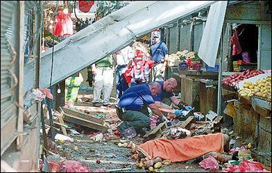 圖:以色列內(nèi)坦亞爆炸3人死亡50多人受傷 2002年05月20日 11:37 ![]() 一名喬裝成以色列士兵的巴勒斯坦自殺炸彈客,十九日在以色列海濱城鎮(zhèn)內(nèi)坦亞發(fā)動爆炸攻擊,炸死自己及另外兩人,并傷及五十多人。(中新網(wǎng)圖)